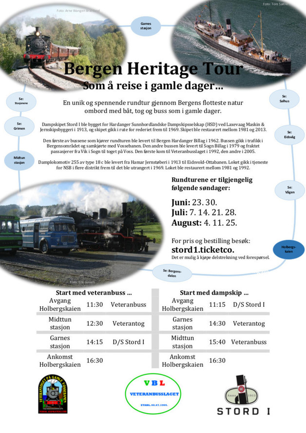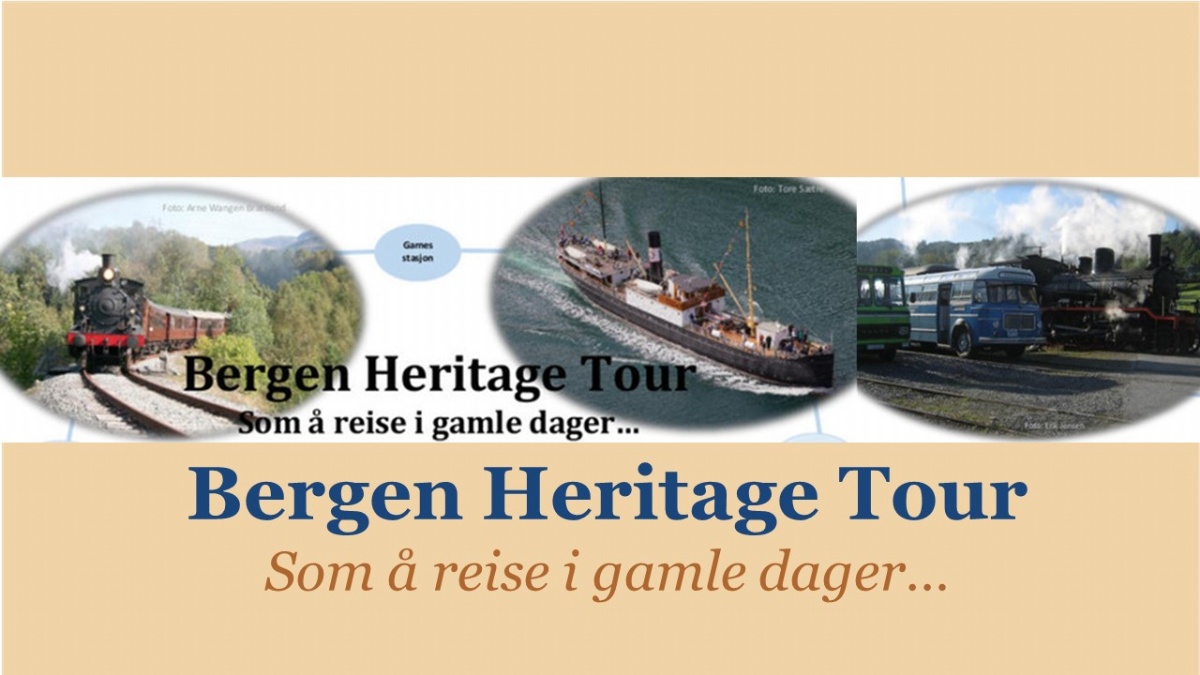 Bergen Heritage Tour - Historisk rundtur med dampbåten "Stord I" , med Gamle Vossebanen som har kullfyrt damplokomotiv og en etappe med veteranbuss.
